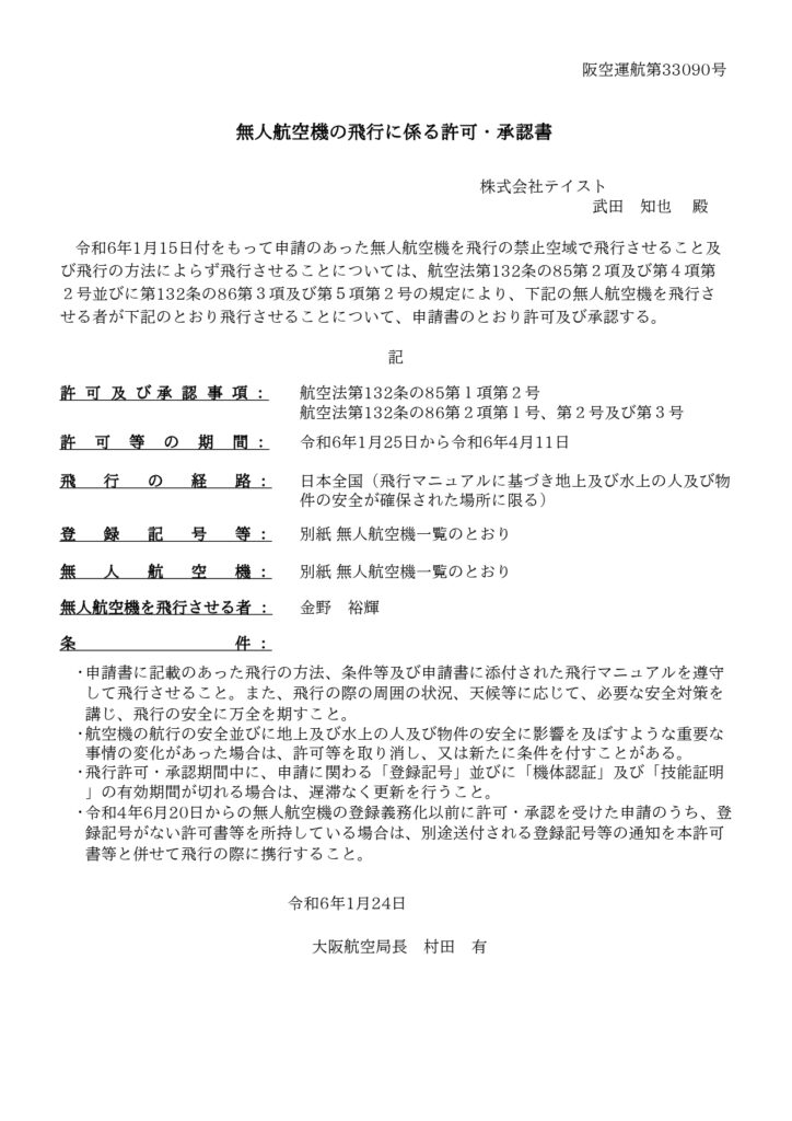 株式会社テイスト > NEWS > NEWS > 【更新】無人航空機の飛行に係る許可・承認書取得のお知らせ NEWS 2024.1.26 【更新】無人航空機の飛行に係る許可・承認書取得のお知らせ この度導入しました機体(DJI Air3)の登録及び、届け出申請が完了しましたことを報告いたします。